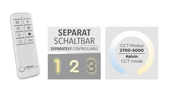 | Verstellbarkeit und Funktion: | dimmbar Farbwechsler Memoryfunktion Funk-Fernbedienung | |