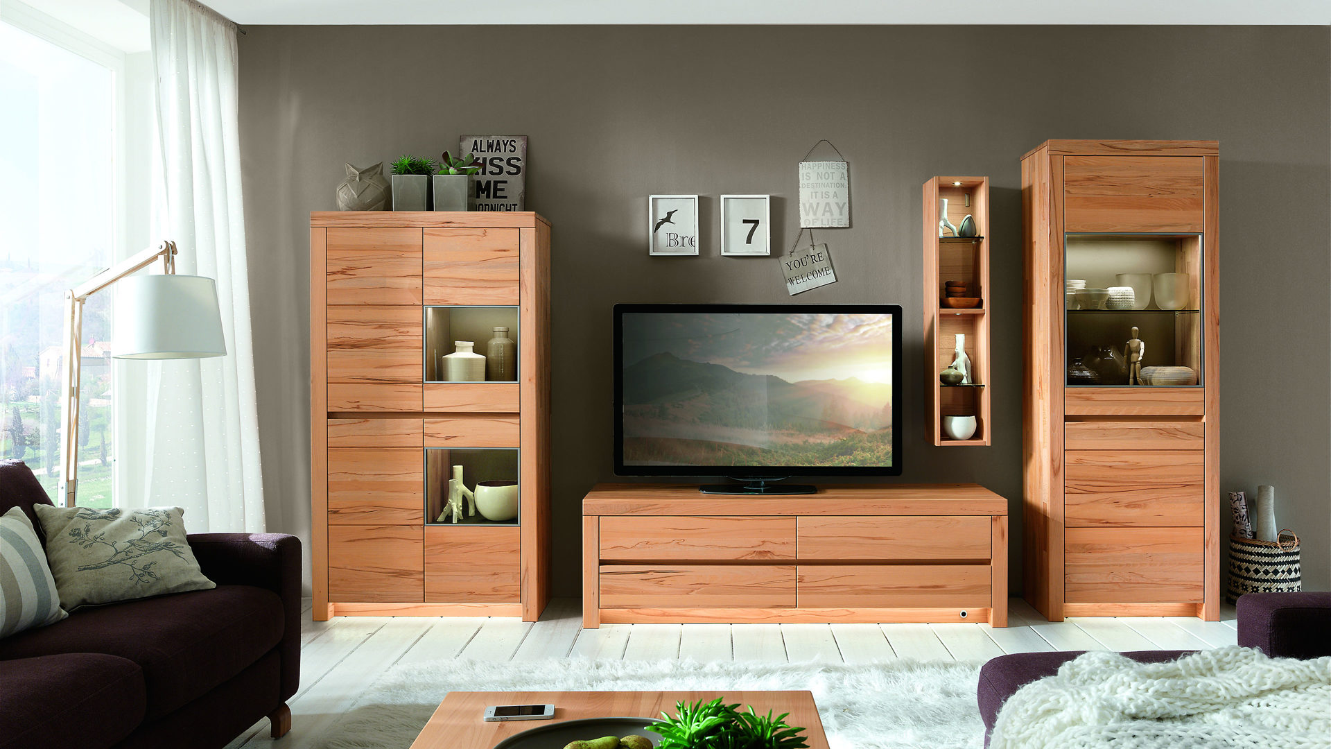 Die vierteilige WÖSTMANN Wohnkombination bzw. Wohnwand aus soft gebürstetem Kernbuchenholz leistet Ihnen gute Dienste.