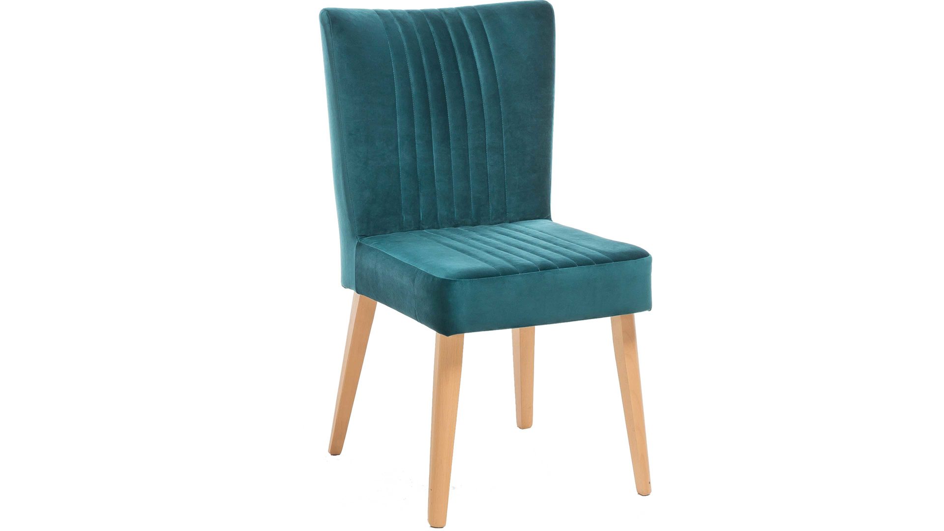 Ein farblicher Hingucker ist der hochwertige Polsterstuhl mit petrolfarbenem Bezug im modernen Samtlook. Aufwendige Steppnähte, die auf Sitz und Rücken angebracht sind, geben dem Sitzmöbel zusätzlich eine interessante Optik. Am besten passt der Polsterstuhl mit den Maßen von ca. 46 x 92 x 66 cm (BxHxT) an einen Esstisch aus Eiche, da auch das Holzgestell aus Eiche natur ist.
