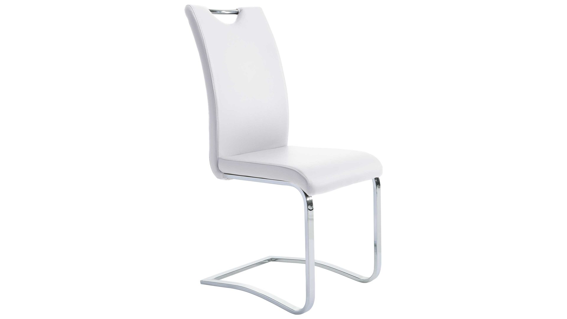 Durch sein betont minimalistisches Design, das sich auf Sitz und Lehne aus weißem, pflegeleichtem Kunstleder und das stabile Schwing-Gestell aus verchromtem Flachrohr beschränkt, passt der Freischwinger besonders gut zu sehr modern eingerichteten Innenräumen.