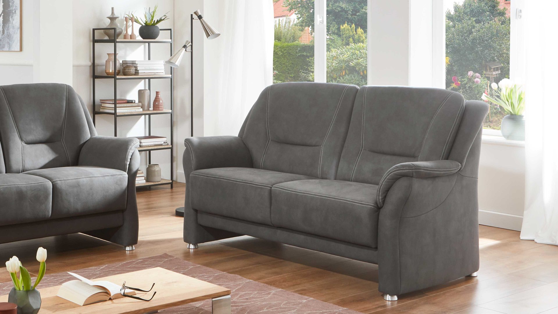 grauer Mikrofaserbezug mit beiger Kontrastnaht