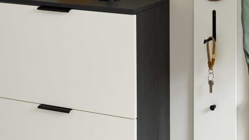 Platziere den Schuhschrank so, dass sich die Klapptüren bequem öffnen lassen und ausreichend Bewegungsfreiheit bleibt. Dank seiner Tiefe von ca. 30 cm eignet er sich ideal für schmale Flure und lässt sich perfekt mit weiteren Möbeln aus der Interliving Garderobe Serie 6015 kombinieren – für ein harmonisches Gesamtbild.