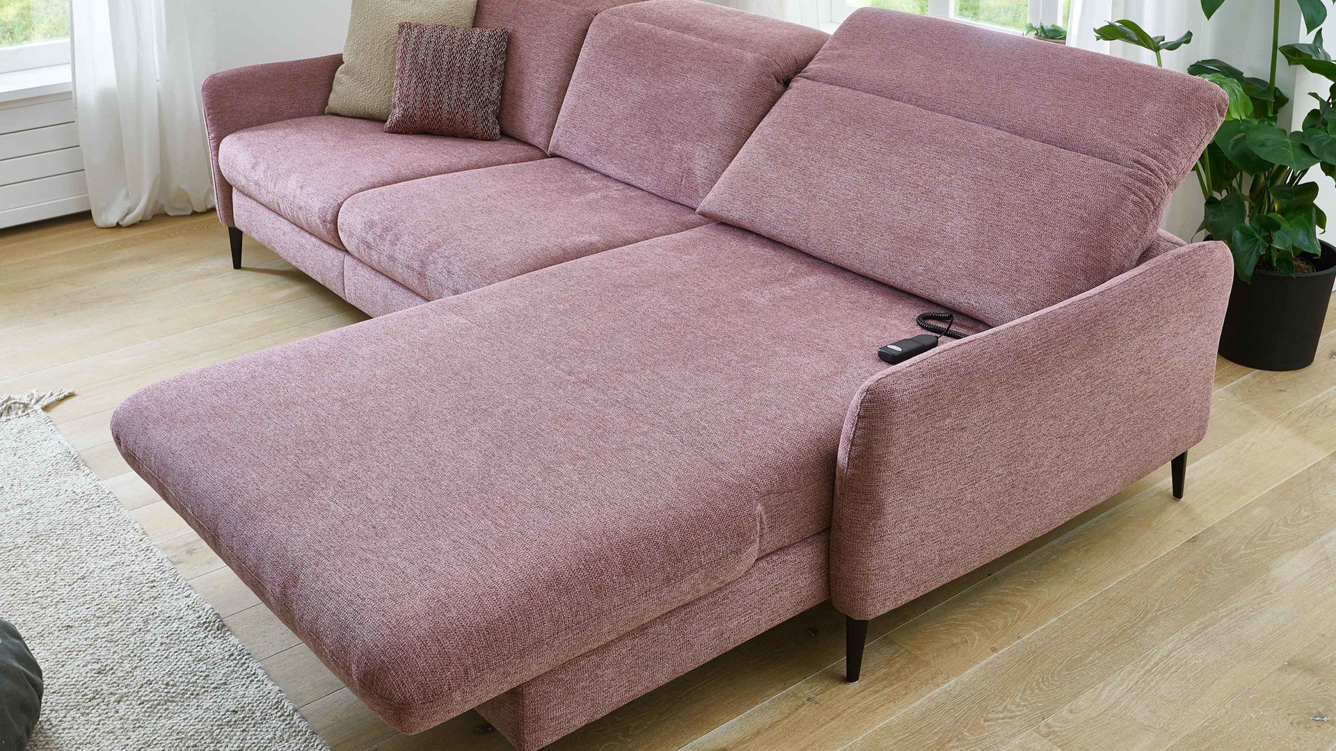 Zu den Highlights des Polsterprogramms gehören die grundsätzlich im Originalstoff bezogenen Rückseiten, die bei allen Elementen enthaltene Kopfpolsterverstellung sowie die für Staubsaugerroboter ideale Bodenfreiheit. Die Serie ist Made in Europe und mit dem Goldenen M ausgezeichnet.
