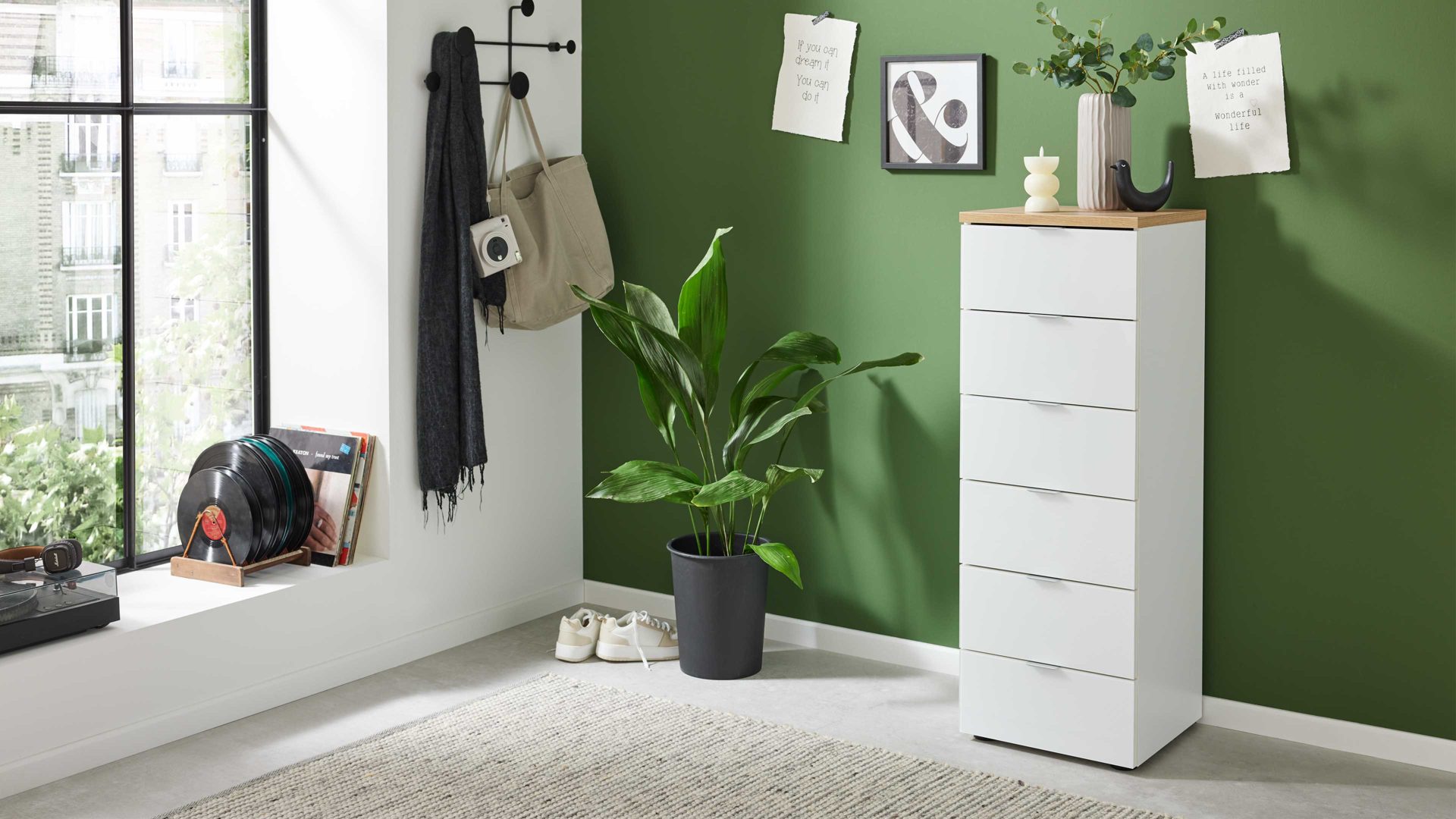 alpinweißes Glas & Artisan Eiche - sechs Schubladen, Höhe ca. 114 cm