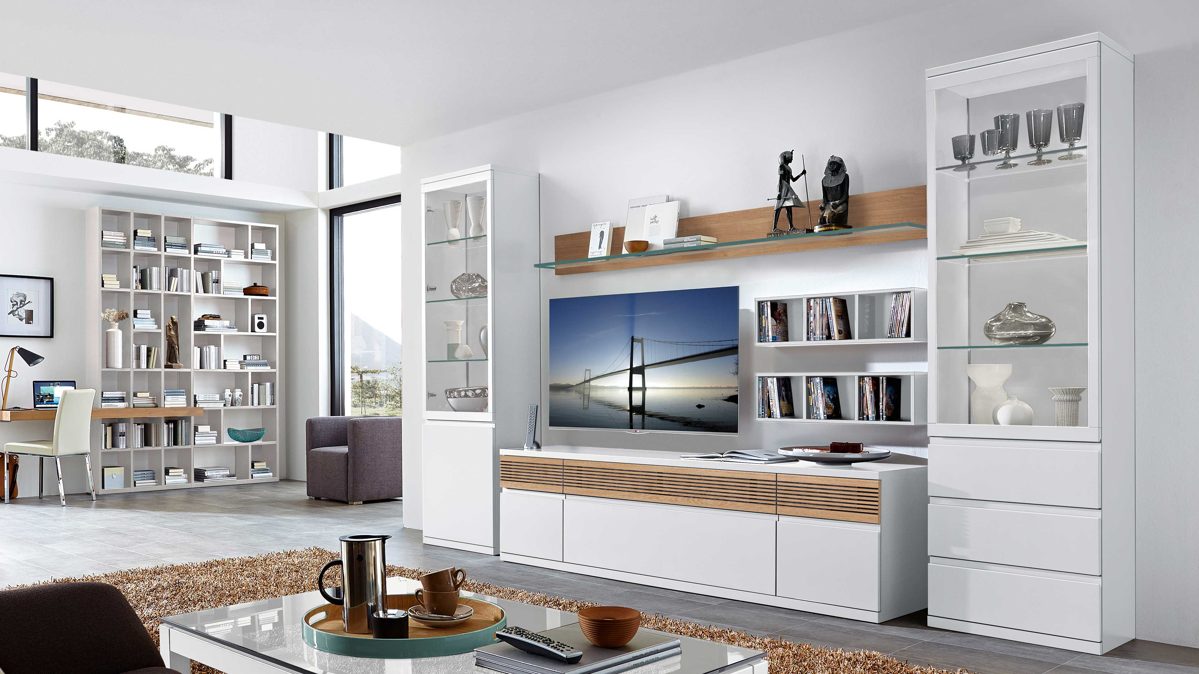 Die Vision Wohnkombination beeindruckt mit mattweißen Lackoberflächen und akzentuierendem Eichefurnier im Farbton Sand. Durch die helle Farbgebung strahlt die Wohnwand herrlich warmen, einladenden Charme aus. Speziell sind überdies die grifflosen Fronten. Zum Öffnen und Schließen der Türen, Klappen, Auszüge und Schubladen dienen unauffällige, praktische Griffleisten.