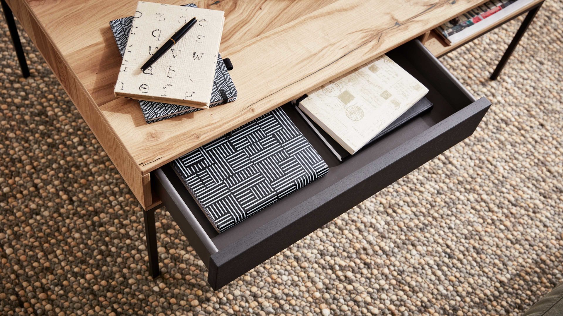 Mit ca. 100 x 42 x 60 cm (B/LxHxT) passt der Tisch perfekt vor Sofa oder Sessel. Praktisch wird’s auch: Er bietet dir eine Schublade mit matt anthrazitfarbener Blende, die dank Vollauszug, Selbsteinzug und Dämpfung besonders komfortabel zu bedienen ist. Dazu kommt ein offenes Fach, ideal für Deko, Magazine oder alles, was du griffbereit haben möchtest. Die anthrazitfarbenen Metallfüße sorgen für Stabilität und runden das moderne Design harmonisch ab.