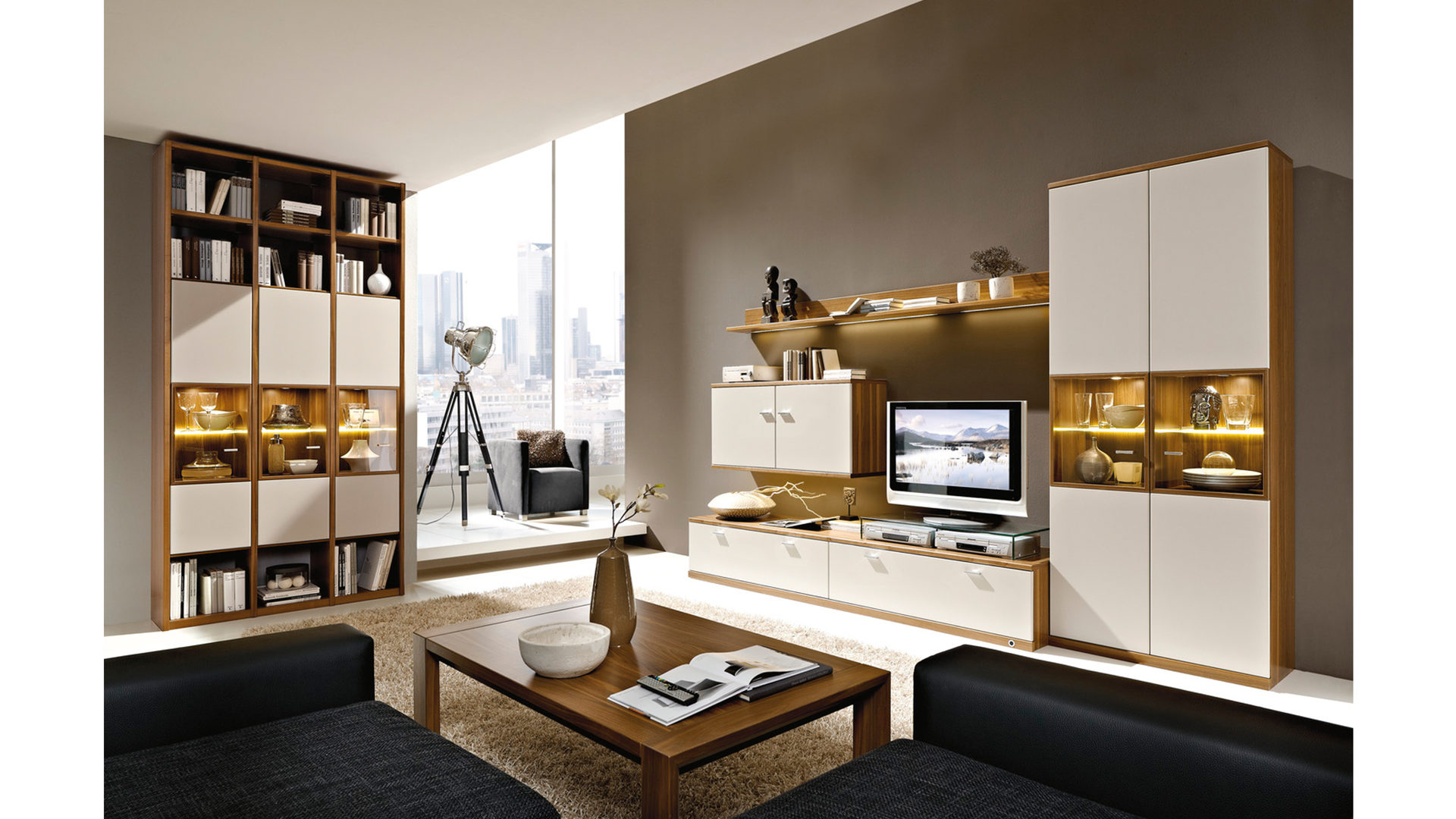 Das Vancouver Wohnregal präsentiert sich in noblem Nussbaumfurnier mit cameofarbenen Lackoberflächen, die Akzente setzen. Durch die herrlich-warmen Töne strahlt die Bücherwand freundlich-einladenden Charme aus.