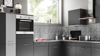 Die Fronten dieser pino Einbauküche sind vorrangig in Grafit designt, kombiniert mit Platingrau. Einen gelungenen Akzent setzen die Korpusseiten und Sockelblenden in Steineiche-Nachbildung. Die Arbeitsplatten präsentieren sich ebenfalls platingrau und steineichefarben. Schlichte Bügelgriffe runden die modern-elegante Optik stilvoll ab.