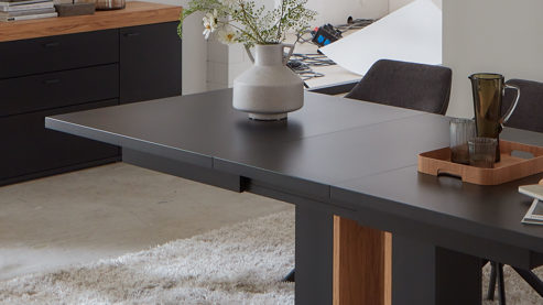 Mit den schwarzgrau lackierten Melaminoberflächen und der akzentuierenden Absetzung in furnierter, geölter Risseiche präsentiert sich der qualitativ hochwertige Auszugtisch aus dem Wohnmöbelprogramm Messina betont modern designt.