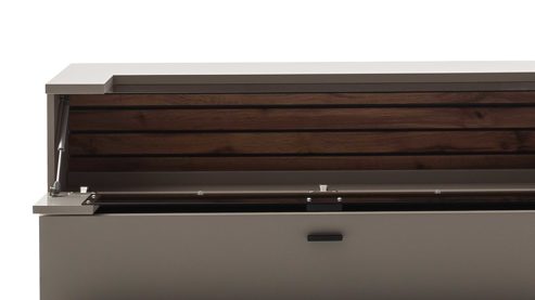 Spaltholz-Rückwand, Beleuchtung und Metall-Kufenfüße sowie weitere dargestellte Einrichtungsgegenstände sind separat gegen Mehrpreis bestellbar.