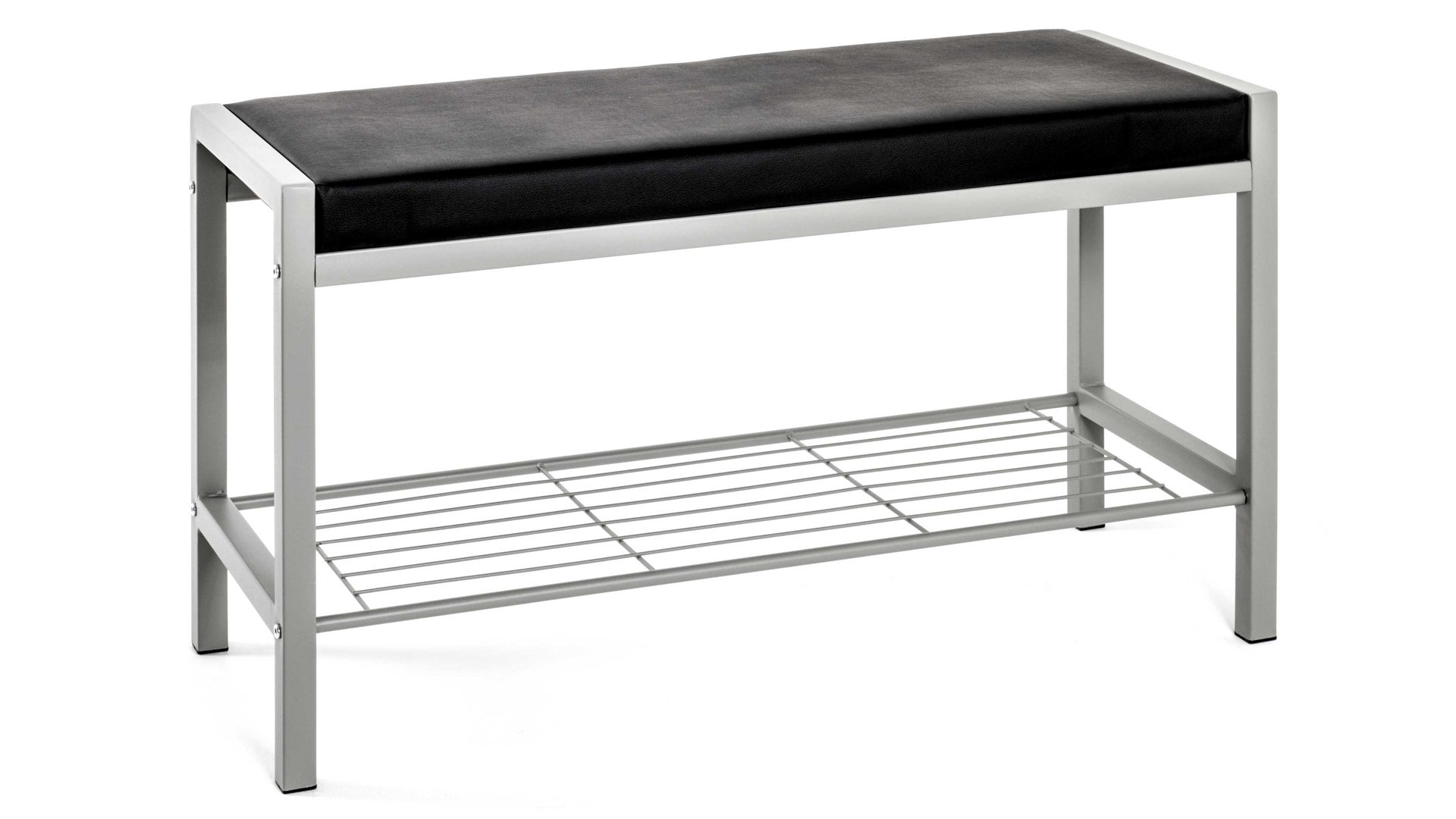 Diese moderne Garderobenbank wird garantiert zu einem Blickfang im Flur oder dem Eingangsbereich Ihres Zuhauses. Gefertigt wurde das praktische Dielenmöbel aus alufarbenem Stahlrohr sowie pflegeleichtem Stahldraht. Ein schwarzer Kunstlederbezug verleiht dem Kleinmöbel einen edlen Touch. Die multifunktionale Sitzbank begeistert nicht nur mit ihrer weich gepolsterten Sitzfläche, sondern auch mit ihren kompakten Maßen von nur ca. 80 x 48 x 32 cm (BxHxT).