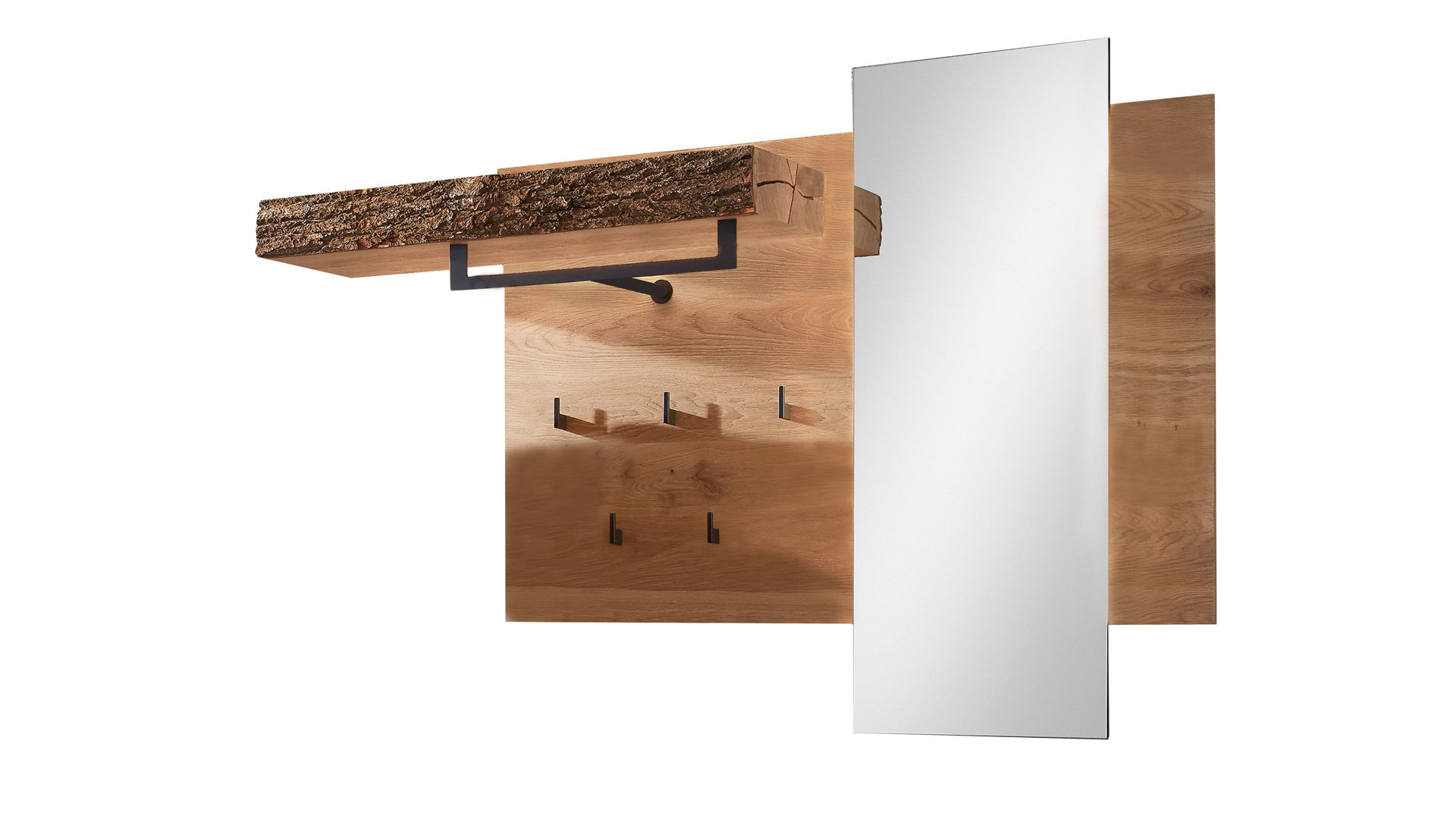 Die Wandgarderobe Runa verbindet massive Kerneiche, einen Baumstamm mit Rinde und anthrazitfarbenes Metall zu einem robusten, modernen und eindrucksvollen Ganzen.