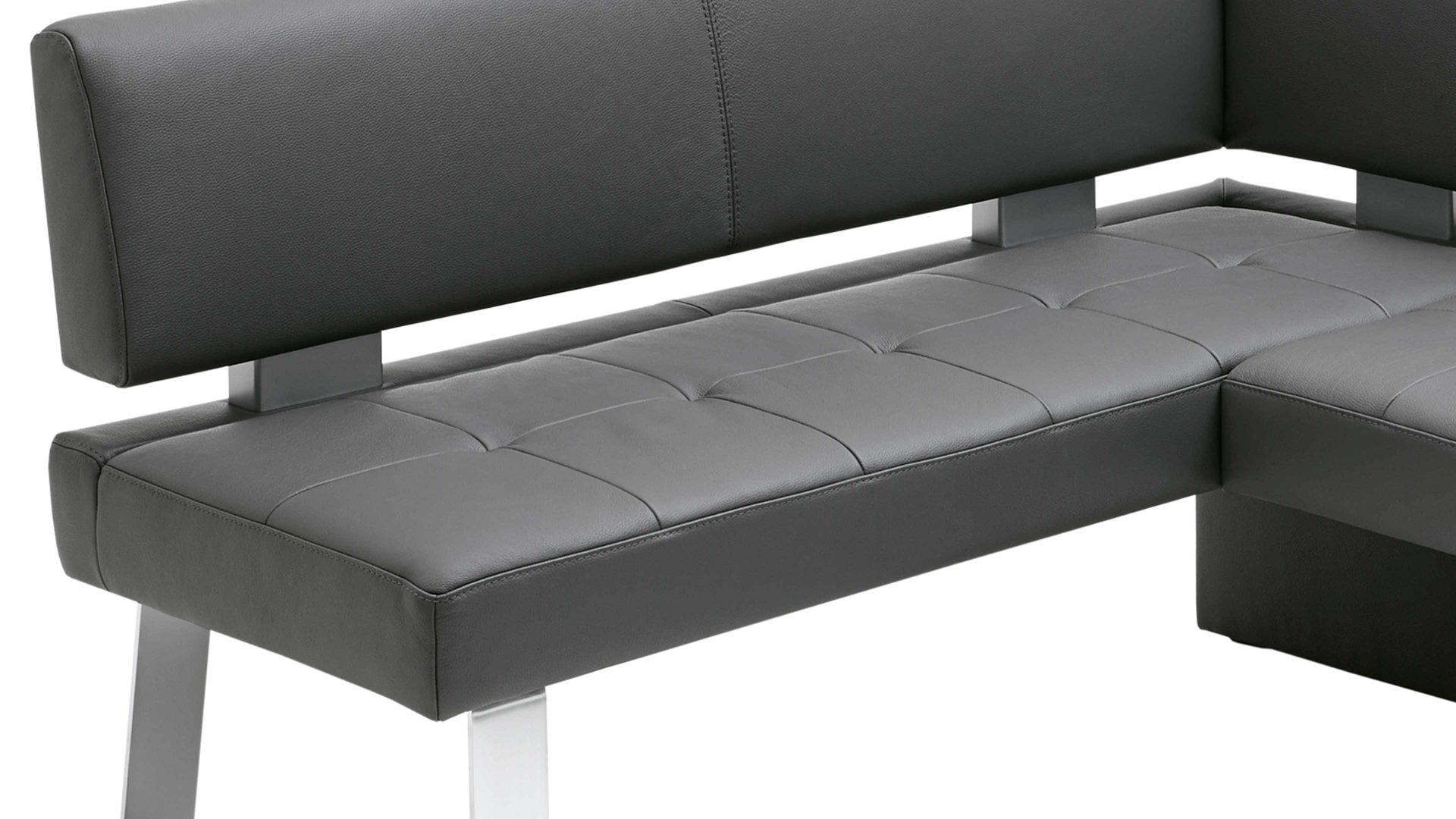 Stilvoll und elegant präsentiert sich die Dinnerbank mit einem grauen LongLife-Dicklederbezug, der sich mit den Nähten im selben Ton harmonisch in Ihre Kücheneinrichtung einfügt. Versammeln Sie Familie und Freunde um Ihren Küchentisch auf der Küchenbank, die Sie über Eck stellen und so auch ungenutzten Raum optimal ausfüllen.