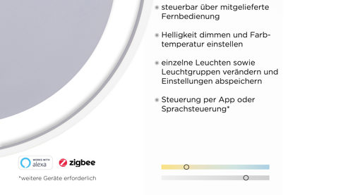| Verstellbarkeit und Funktion: | dimmbar ZigBee®-fähig Funk-Fernbedienung per App steuerbar Sprachsteuerung Alexafähig Memoryfunktion  | |