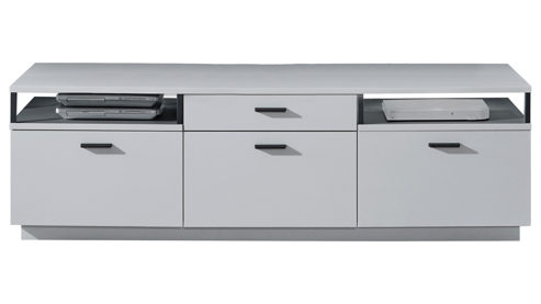 dreitüriges Lowboard mit drei Holzböden, einer Schublade und zwei offenen Fächern