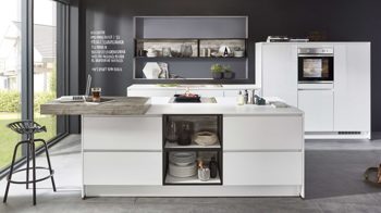 Durch die perfekt aufeinander abgestimmten Farbtöne strahlt die qualitativ hochwertige Systemküche puristische Eleganz mit natürlich anmutendem Charme aus.