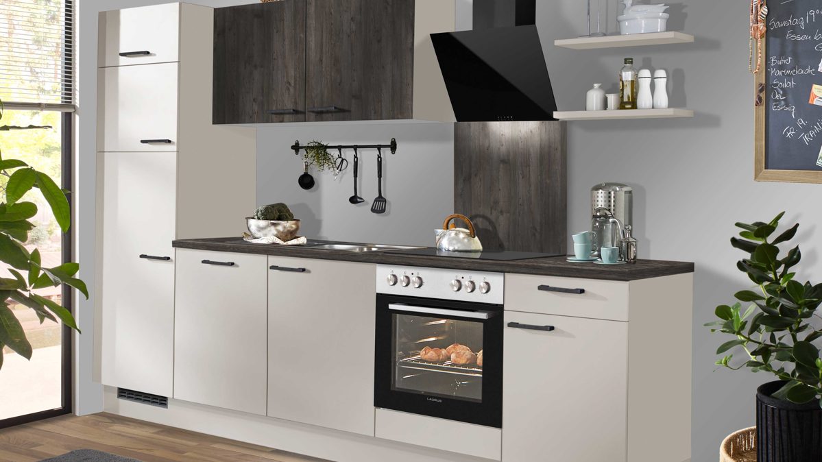 Küchenzeile mit starekn Akzentfronten, hochwertiger Edelstahl-Einbauspüle und Nischenverkleidung, Länge ca. 290 cm