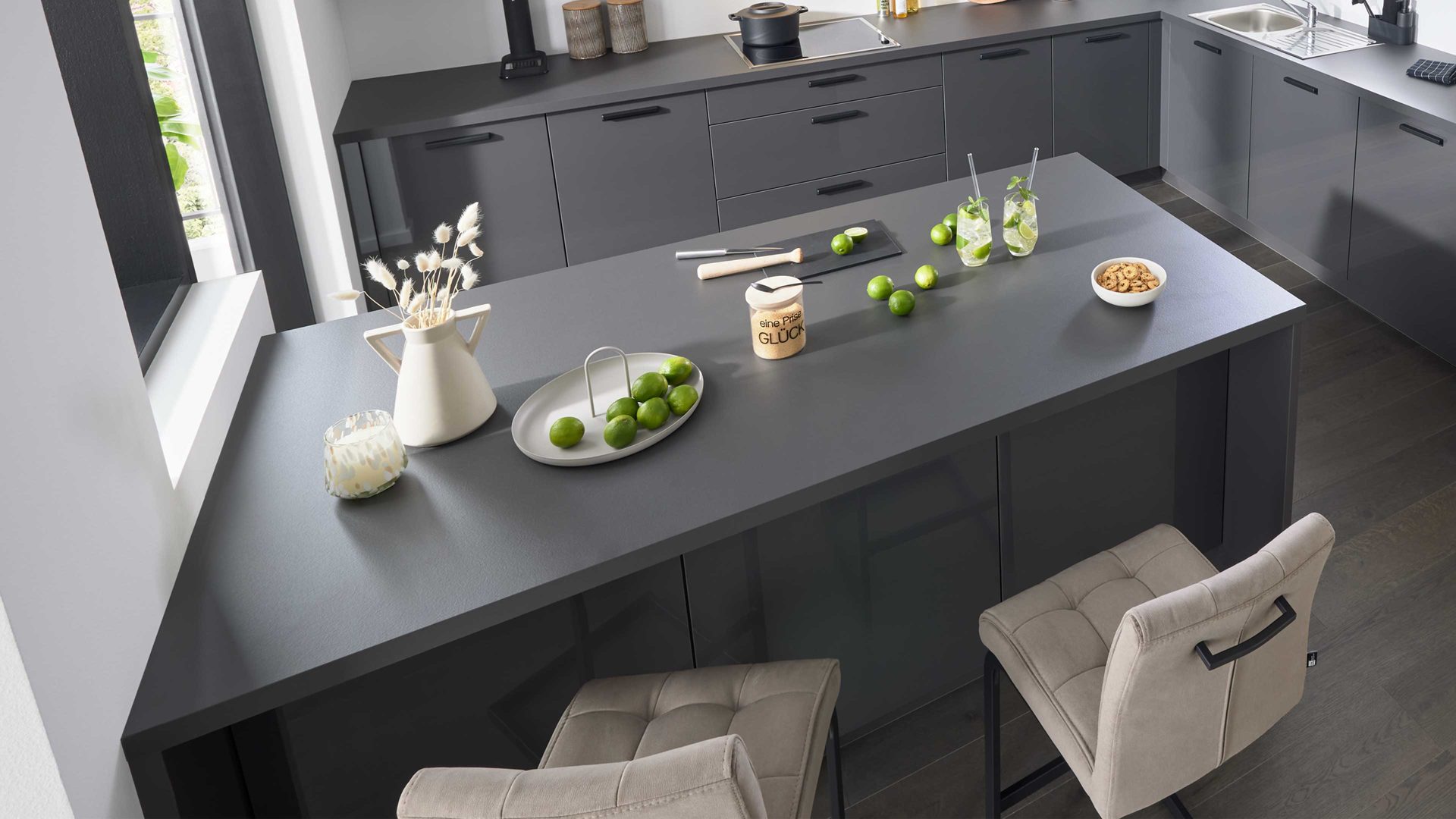 • Die Abbildung zeigt ein Wohnbeispiel, welches auch Dekoration sowie separat erhältliches Zubehör enthält. Im Lieferumfang enthalten sind eine Kücheninsel und eine Hochschranklösung.