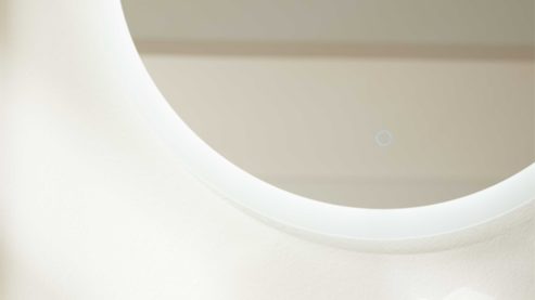 Der runde Wandspiegel überzeugt durch seine klare Formensprache und sein edles Erscheinungsbild. Mit einem Durchmesser von ca. 75 cm und einer Tiefe von ca. 3 cm wirkt er filigran und zugleich hochwertig. Das fest verbaute LED-Leuchtmittel (20 Watt) sorgt für gleichmäßige Ausleuchtung und ist in der Energieeffizienzklasse F (Spektrum A bis G) eingestuft.