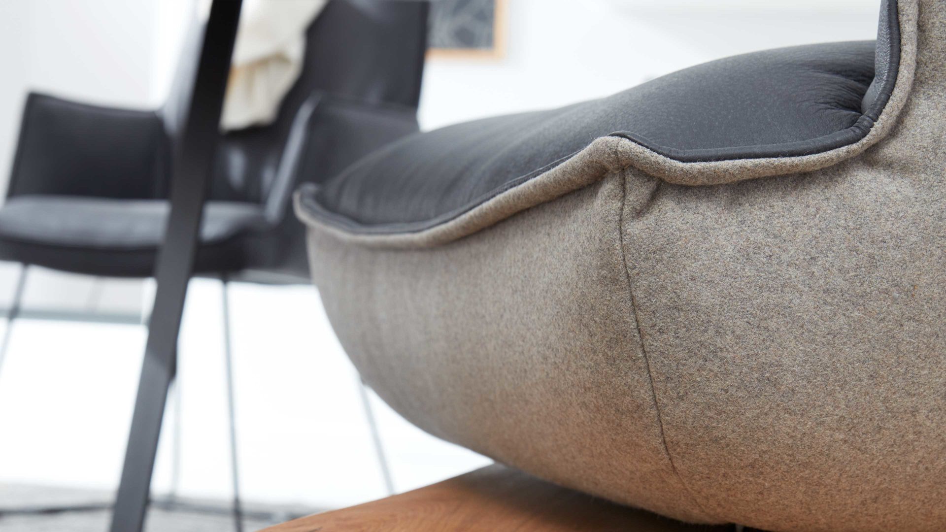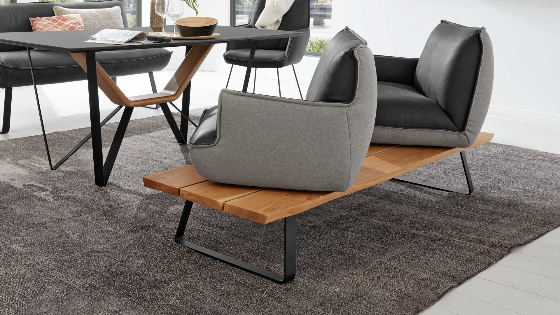 Als Basis fungieren ein mattschwarz pulverbeschichtetes Flachkufengestell mit Struktur sowie ein UV-beschichtetes Wildeichen-Plateau mit Öl-Effekt. Letzteres sorgt für eine natürlich-warme Note. Die beiden Sitzeinheiten der außergewöhnlichen Esszimmerbank sind innen mit dunklem Leder bezogen - außen weisen sie einen Lodenbezug auf.