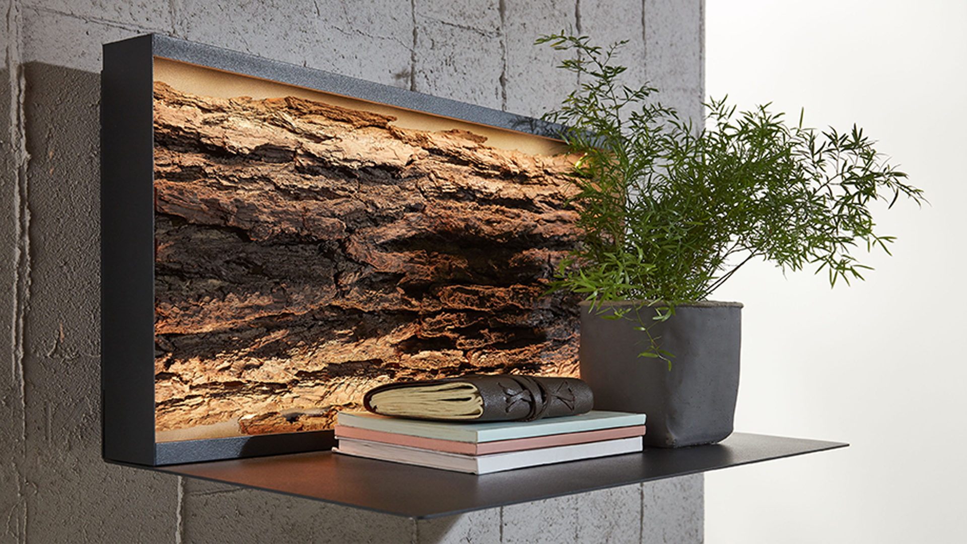 Das Wandregal Runa verbindet eine Rückwand aus Rindenholz und anthrazitfarben pulverbeschichtetes Metall zu einem robusten, modernen und eindrucksvollen Ganzen. Durch das Rindenholz bringt das kreative Regal authentische Natürlichkeit in den Flur.