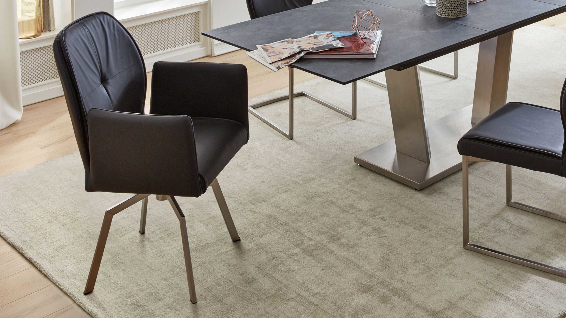 Das mattschwarze Metall-Stativgestell unterstreicht die klare Linienführung und ergänzt den Look stilvoll. Die Sitzfläche mit hochwertiger Taschenfederkernpolsterung und die Rückenlehne mit viskoelastischer Komfortpolsterung garantieren dir ein besonders bequemes Sitzerlebnis – auch bei ausgedehnten Dinnern.