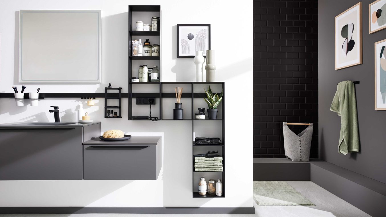 • Die Abbildung zeigt ein Wohnbeispiel, welches auch Dekoration sowie separat erhältliches Zubehör enthält. Im Lieferumfang enthalten sind ein Waschbecken, zwei Auszugschränke und ein Abdeckboden.