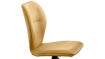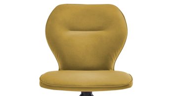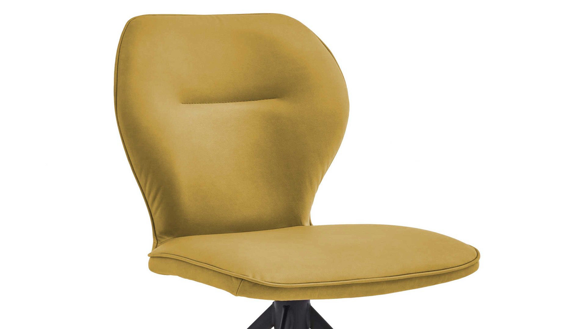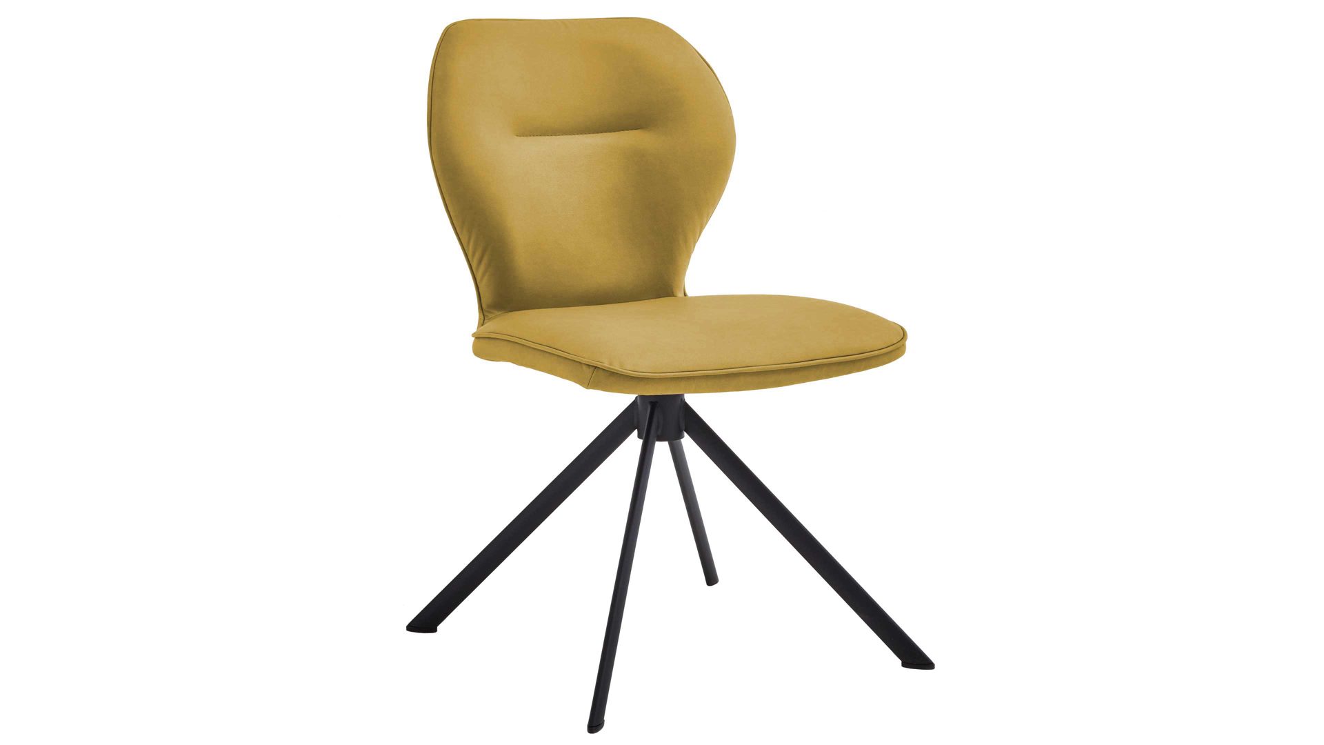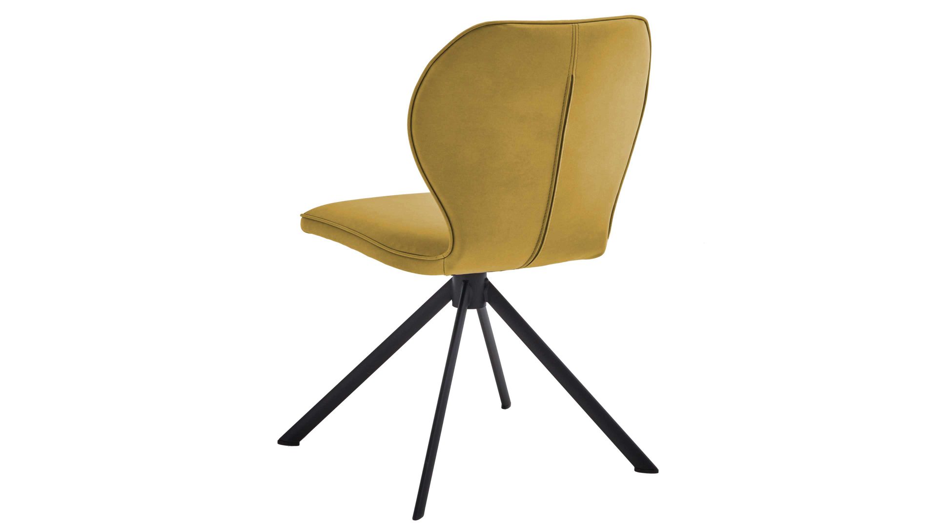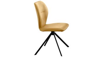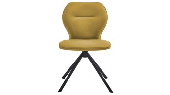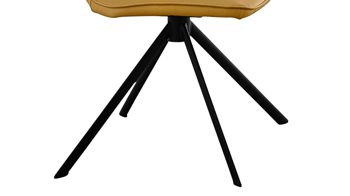Er kombiniert ein mattschwarz lackiertes Stativgestell aus robustem Eisen mit einem gelben Mikrofaserbezug in Lederoptik und fügt sich in verschiedene Wohnstile harmonisch ein. Zu den optischen Highlights des Esszimmerstuhls gehört neben der Formensprache und den perfekt aufeinander abgestimmten Farben der markante Quereinzug im Rücken.