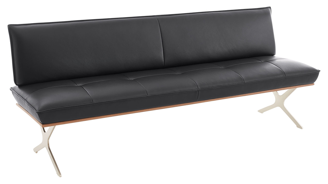 krähenfarbener Lederbezug, kombiniert mit einer grauen Kontrastnaht, naturfarbenem Wildeichefurnier und edelstahlfarbenem Stahl