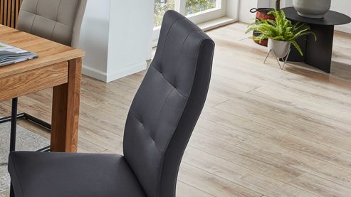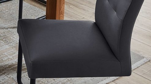 dunkelgrauer Stoffbezug in Lederoptik, kombiniert mit mattschwarz lackiertem Metall