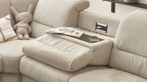 Das Programm bietet eine beeindruckende Typen- und Bezugvielfalt, wobei alle Rückseiten im Originalstoff bezogen sind und die Bezüge wahlweise mit oder ohne Kontrastnaht umgesetzt werden können. Überdies stehen sieben Fußvarianten, zwei preisgleiche Sitzhöhen und mit Kaltschaum, Federkern und - gegen Aufpreis - Boxspring drei Sitzqualitäten zur Wahl.