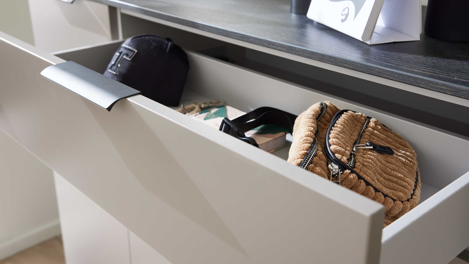 Eine breite Schublade oberhalb schafft Platz für Dinge des Alltags: Schlüssel, Handschuhe, Brillenetuis oder Pflegeprodukte sind so jederzeit griffbereit und ordentlich verstaut – ohne offen herumzuliegen.