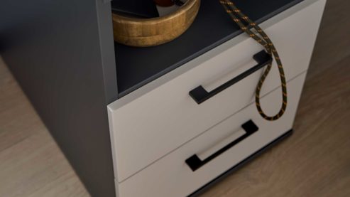 Links befindet sich ein schon fertig montierter Container mit offenem Fach und zwei Schubladen, der dir vielseitigen Stauraum für Bücher, Unterlagen und Arbeitsmaterialien bietet. Die Schubladen mit Soft-Stop-Einzug schließen angenehm leise und sorgen für zusätzlichen Komfort im Alltag.
