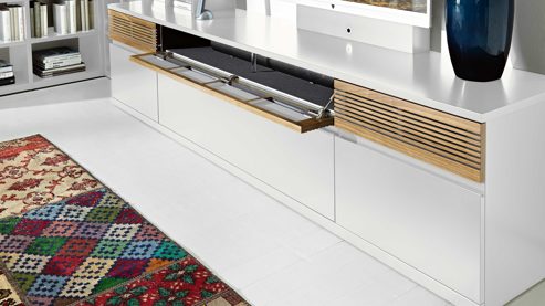 Die Vision Wohnkombination beeindruckt mit mattweißen Lackoberflächen und akzentuierendem Eichefurnier im Farbton Sand. Durch die helle Farbgebung strahlt die Wohnwand herrlich warmen, einladenden Charme aus. Speziell sind überdies die grifflosen Fronten. Zum Öffnen und Schließen der Türen, Klappen, Auszüge und Schubladen dienen unauffällige, praktische Griffleisten.