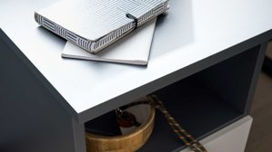 Links befindet sich ein schon fertig montierter Container mit offenem Fach und zwei Schubladen, der dir vielseitigen Stauraum für Bücher, Unterlagen und Arbeitsmaterialien bietet. Die Schubladen mit Soft-Stop-Einzug schließen angenehm leise und sorgen für zusätzlichen Komfort im Alltag.