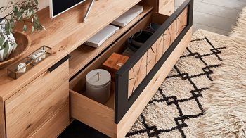 soft gebürstete Wildeiche, kombiniert mit carbonfarbenen Lackoberflächen, massiven Hirnholz-Akzenten und carbonfarben strukturgepulvertem Metall