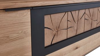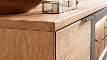 soft gebürstete Wildeiche, kombiniert mit carbonfarbenen Lackoberflächen, massiven Hirnholz-Akzenten und carbonfarben strukturgepulvertem Metall