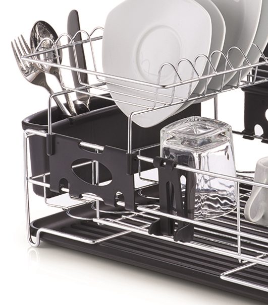Der Abtropfständer ist aus langlebigem schwarzem Kunststoff gefertigt und wird durch zeitloses verchromtes Metall ergänzt. Erleben Sie die durchdachten Funktionen des Geschirrständers, denn neben dem platzsparenden 2-Ebenen-Design weist der Geschirrständer zahlreiche multifunktionale Eigenschaften auf. Der Küchenhelfer erleichtert Ihren Alltag durch einen entnehmbaren Abtropfbehälter für neun Messer, Abtropfkorb für Besteck mit drei Fächern sowie seitliche Halterungen zur Trocknung von drei Gläsern: Außerdem weist der robuste Kunststoff zusätzliche Rillen auf. Sie erhalten den Geschirrabtropfständer mit den Maßen von ca. 44 x 29 x 40 cm (BxHxT), sodass er in viele Küchen passt und jede Arbeitsfläche unkompliziert bereichert.