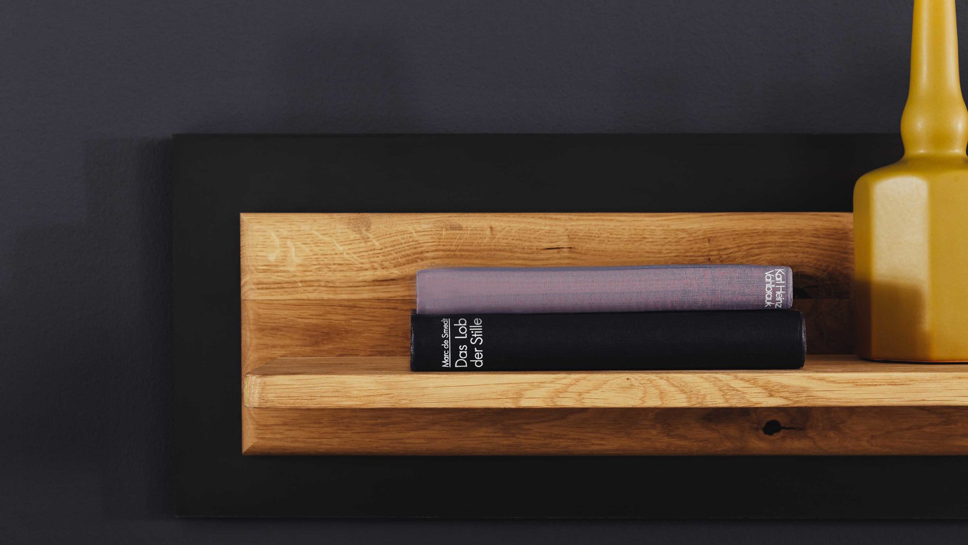 geölte Wildeiche, kombiniert mit geöltem Wildeiche-Furnier und anthrazitfarben lackierten Rückwänden