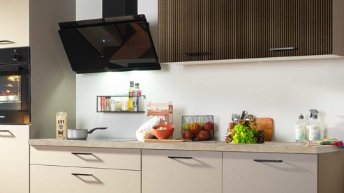 hochgebauter Backofen, vollintegrierter Kühlschrank und eine kopffreie Dunsthaube