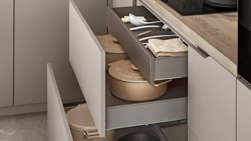 Die integrierten Hochschränke bieten Platz für den hochgebauten LAURUS Backofen LEB10PBK mit Pyrolyse und Energieeffizienzklasse A (Spektrum A+++ bis D). Die erhöhte Einbauposition sorgt für ergonomischen Bedienkomfort und erleichtert den Alltag.