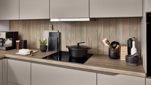 Rechts befindet sich das LAURUS Glaskeramik-Kochfeld LCA600, ergänzt durch Hängeschränke und eine elica Flachschirmhaube ELITE1460D mit Energieeffizienzklasse D (Spektrum A+++ bis D). Die Nischenverkleidung in macchiatofarbener Lattenoptik unterstreicht den wohnlichen Charakter und setzt einen dezenten Designakzent hinter dem Arbeitsbereich.