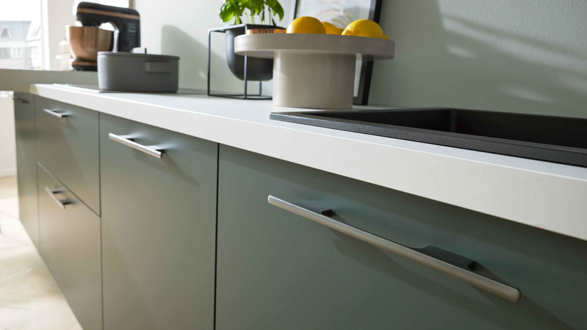 Die Interliving Küche Serie 3059 vereint matte schwarzgrüne Fronten mit einem quarzgrauen Korpus und titanfarbenen Metallgriffen. Einen besonderen Akzent setzen die Platten in weißer Marmor-Nachbildung, die der Küche eine exklusive Note verleihen. Schwarze Sockelblenden runden das modern-elegante Gesamtbild perfekt ab.