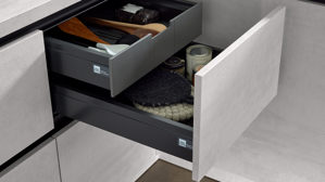 Die Interliving Küche Serie 3080 bietet modernes Küchendesign mit klaren Linien und funktionalen Details. Die Fronten in weißer Beton Nachbildung werden durch mattes Platingrau und mattschwarze Griffleisten stilvoll ergänzt. Das Ergebnis ist ein edler Materialmix mit urbanem Charakter – perfekt für eine moderne Küchenarchitektur.