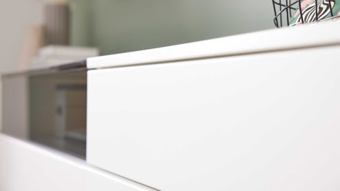 Aufsatz- und Unterbauregal für den Schreibtisch, kabellose Lademöglichkeit, Einbausteckdose und weitere dargestellte Einrichtungsgegenstände sind separat gegen Mehrpreis bestellbar.