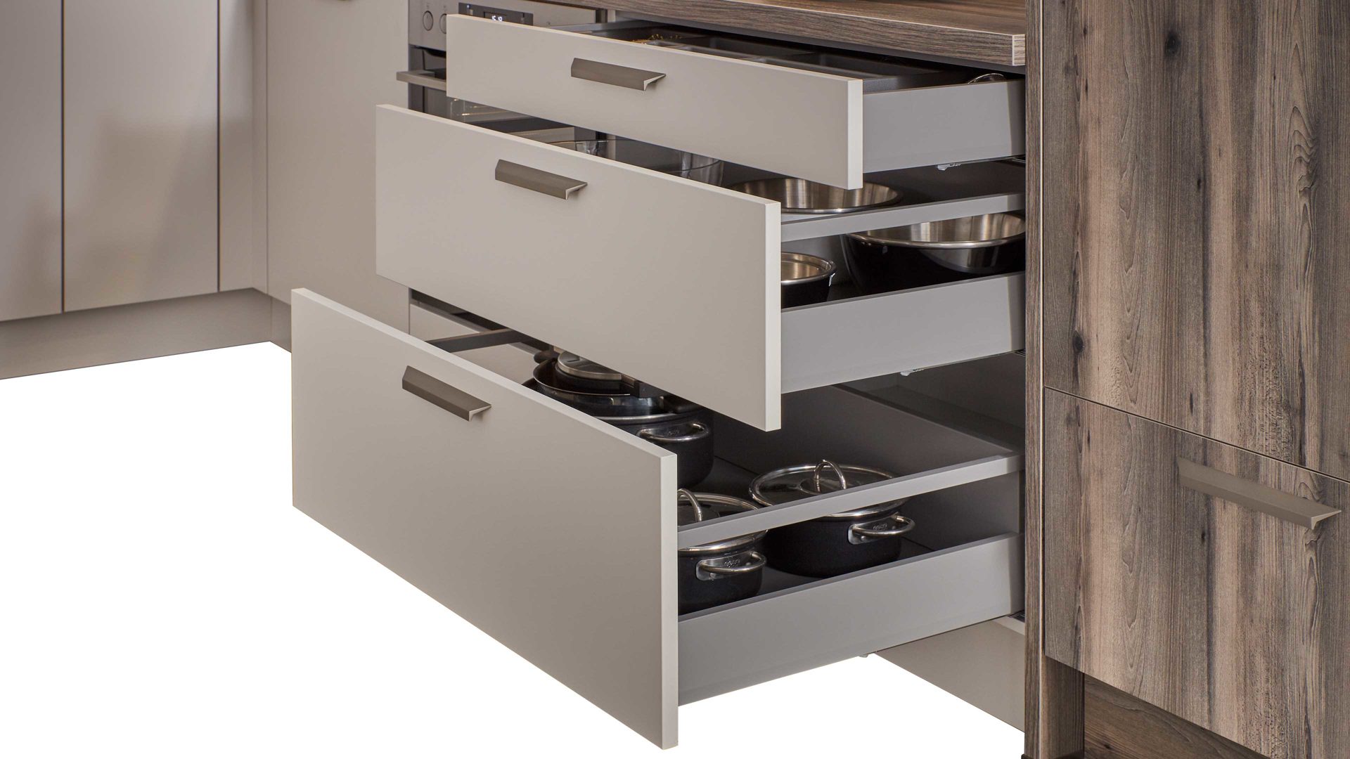 Gelungene Akzente setzen die Frontbereiche, Arbeitsplatten und Regalböden in attraktiver Virginia Eiche-Nachbildung. Der charmante Farbton verleiht der Planküche Made in Germany eine natürliche und warme Ausstrahlung. Edelstahlfarbene Griffe runden die moderne Optik harmonisch ab.