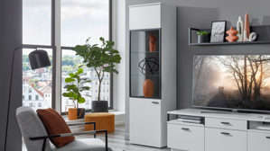 • Die Abbildung zeigt ein Wohnbeispiel, welches auch Dekoration sowie separat erhältliches Zubehör enthält. Im Lieferumfang enthalten ist eine Vitrine mit Deckboden-Beleuchtung.