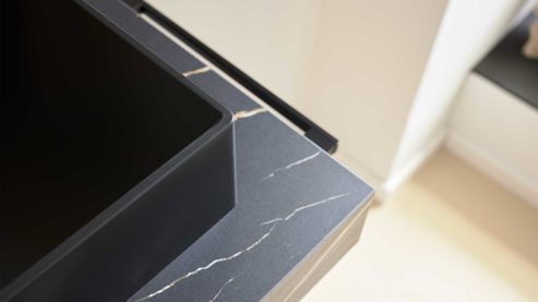Mit dem edlen Konsolen-Set in Marmor Venato Nero-Nachbildung aus der Interliving Bad Serie 3725 entscheidest du dich für ein Badmöbel mit Statement-Charakter. In Kombination mit zwei mattschwarzen Duratek®-Aufsatzwaschbecken entsteht eine elegante, funktionale Einheit, die modernen Ansprüchen an Design und Alltagstauglichkeit gerecht wird – ideal für stilvolle Familienbäder oder Gästebereiche.