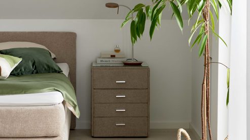 Kombiniere die Nachtkommode idealerweise mit dem passenden Polsterbett der Serie, um ein stimmiges Gesamtbild zu erzielen.