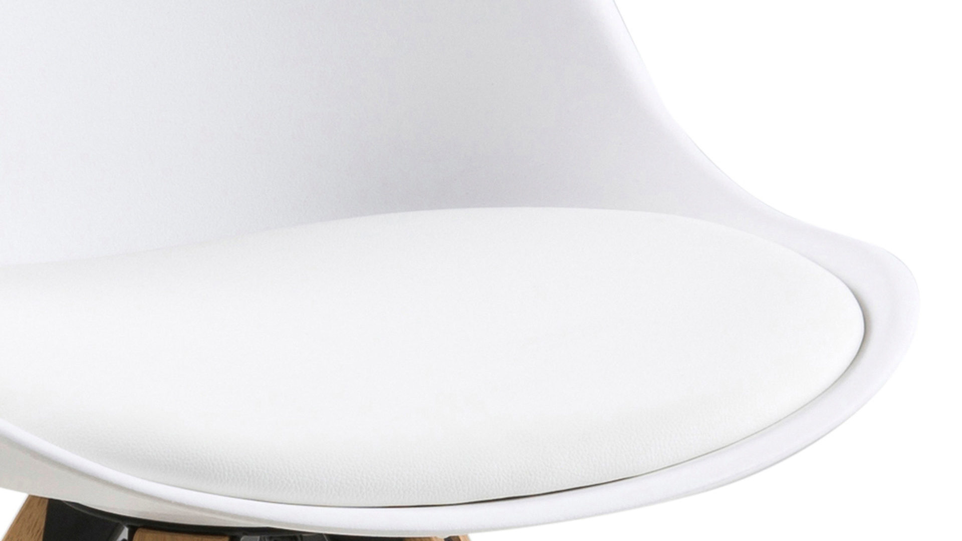 Das Kunstleder-Sitzkissen sorgt zusätzlich für ein komfortables Sitzgefühl. Die Beine des Schalenstuhles sind aus robustem Rubberwood – dem Holz des Kautschukbaumes – gefertigt und eichenfarben gebeizt und geölt. Sie bilden so einen warmen Kontrast zum kühlen Weiß der Sitzschale. Insgesamt hat der Vierfuß-Stuhl eine Größe von ca. 44 x 85 x 42 cm (BxHxT) und passt damit hervorragend an Küchentische und Esstische. Einzeln arrangiert, zum Beispiel im Flur oder Schlafzimmer, ist das Sitzmöbel ebenfalls ein außergewöhnlicher Blickfang.